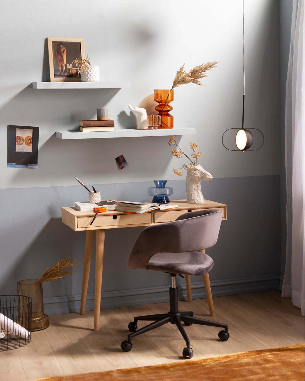 Blåfarger kan bidra til å gjøre rommet harmonisk og gjøre at veggene ikke føles påtrengende. Blått er, i likhet med grønt, nedstressende og gir en behagelig og avbalansert atmosfære som kan være et godt valg til et hjemmekontor. Her har vi valgt fargene 4474 Vinterslør på øvre del av veggen og 4465 Misty Blue på nedre del. Skillet gir en god balanse i rommet, og nyansene sørger for en luftig atmosfære.